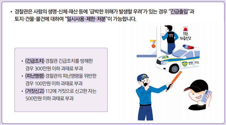 - 사람의 생명·신체·재산 등에 급박한 위해가 발생할 우려가 있는 경우, 경찰관은 긴급출동과 토지·건물·물건에 대해 일시사용·제한·처분이 가능합니다.