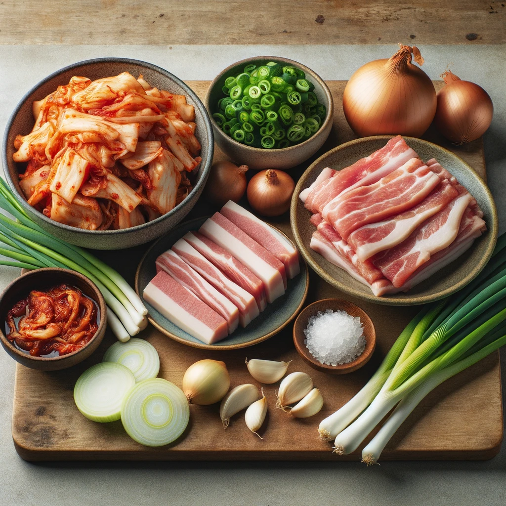 이제 김치찌개를 만들기 위한 첫 단계, 필요한 재료들을 준비하는 모습을 볼 수 있습니다.