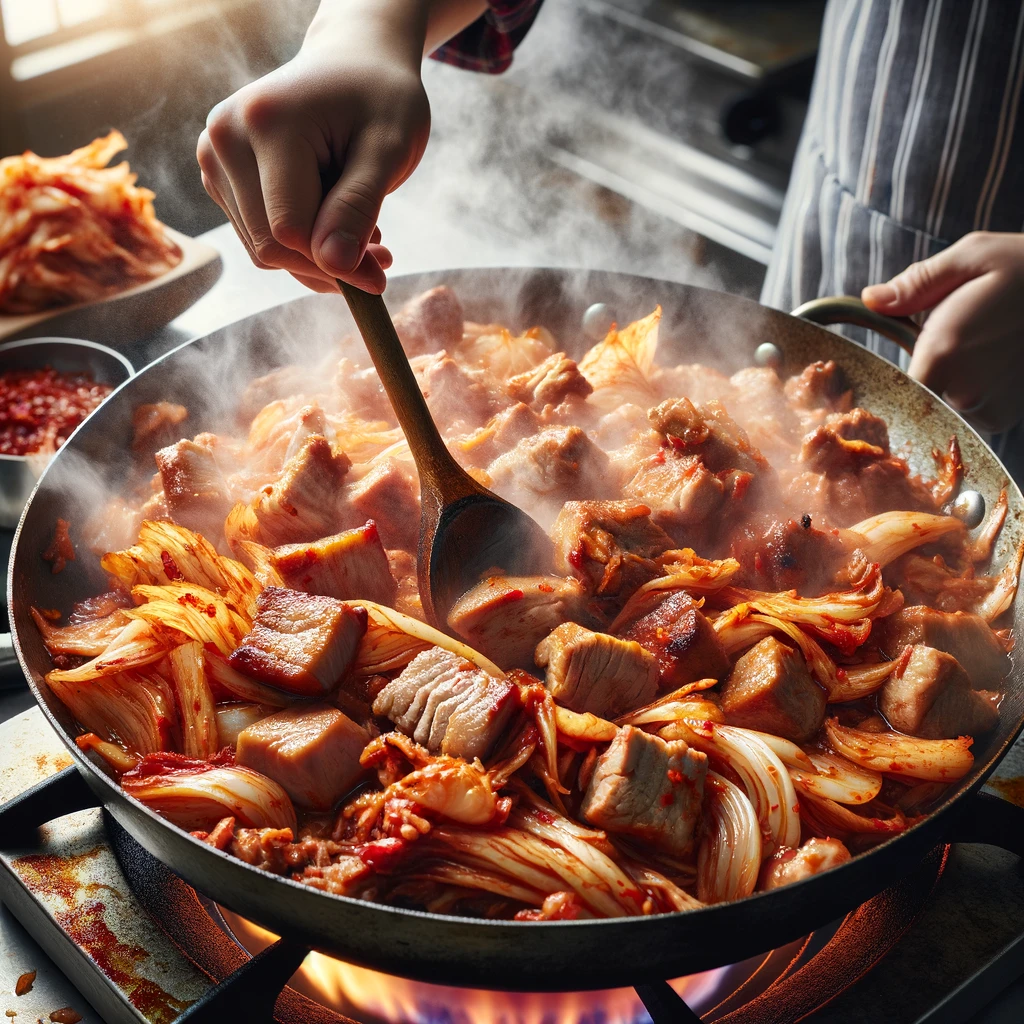 돼지고기가 반쯤 익었을 때, 김치를 넣어 고기와 잘 어우러지도록 중불에서 볶는 모습
