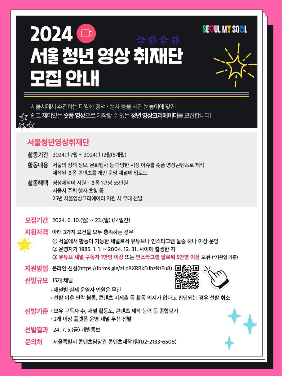 서울시 2024년 서울청년영상취재단 모집 "숏폼 영상 크리에이터 도전하세요!" 본문